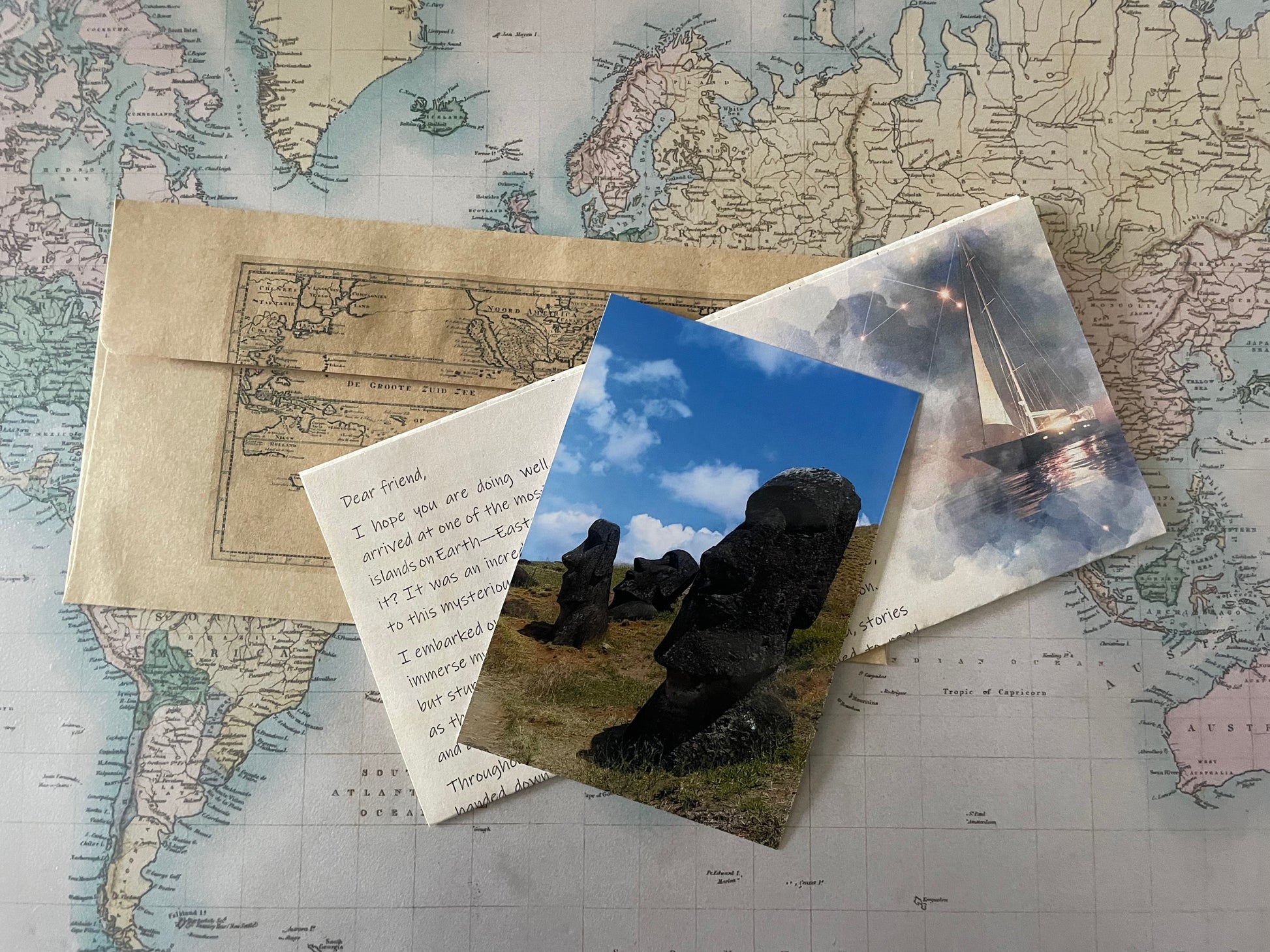 - The paper letter includes the envelope, a real stamp, the letter and a photo of Easter Island.
