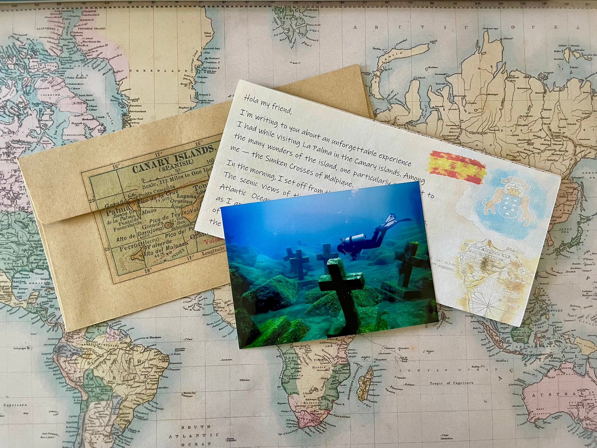 - The paper letter includes the envelope, a real stamp, the letter and a photo of the dive.