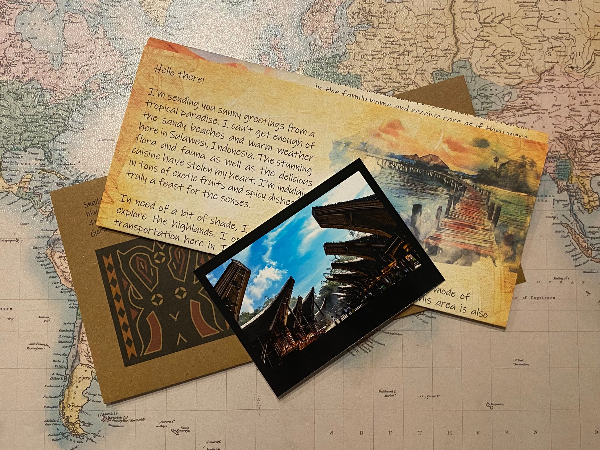 - The paper letter includes the envelope, a real stamp, the letter and a photo from a traditional Sulawesi village.