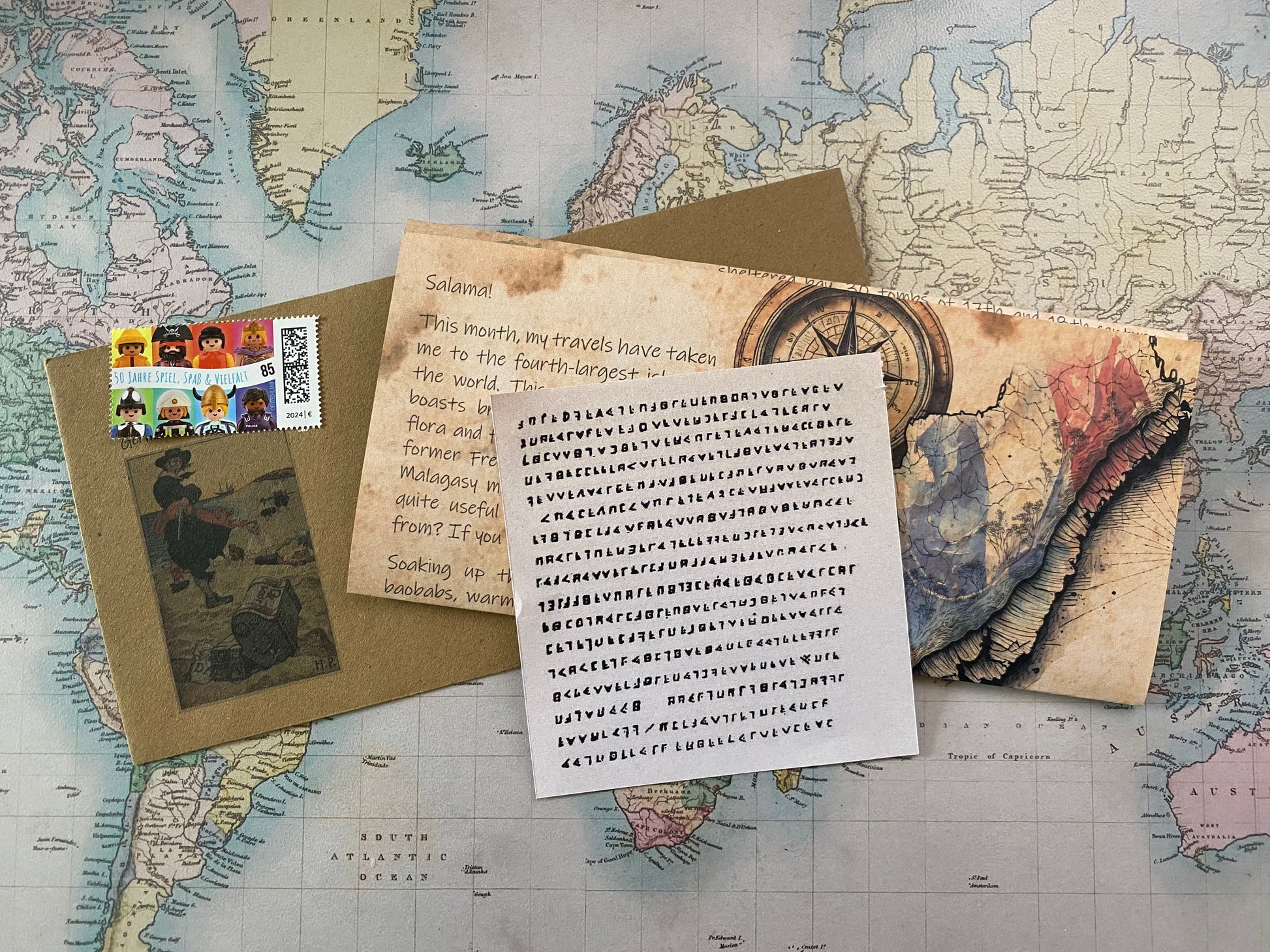 - The paper letter includes the envelope, a real stamp, the letter and a real pirate cryptogram.
