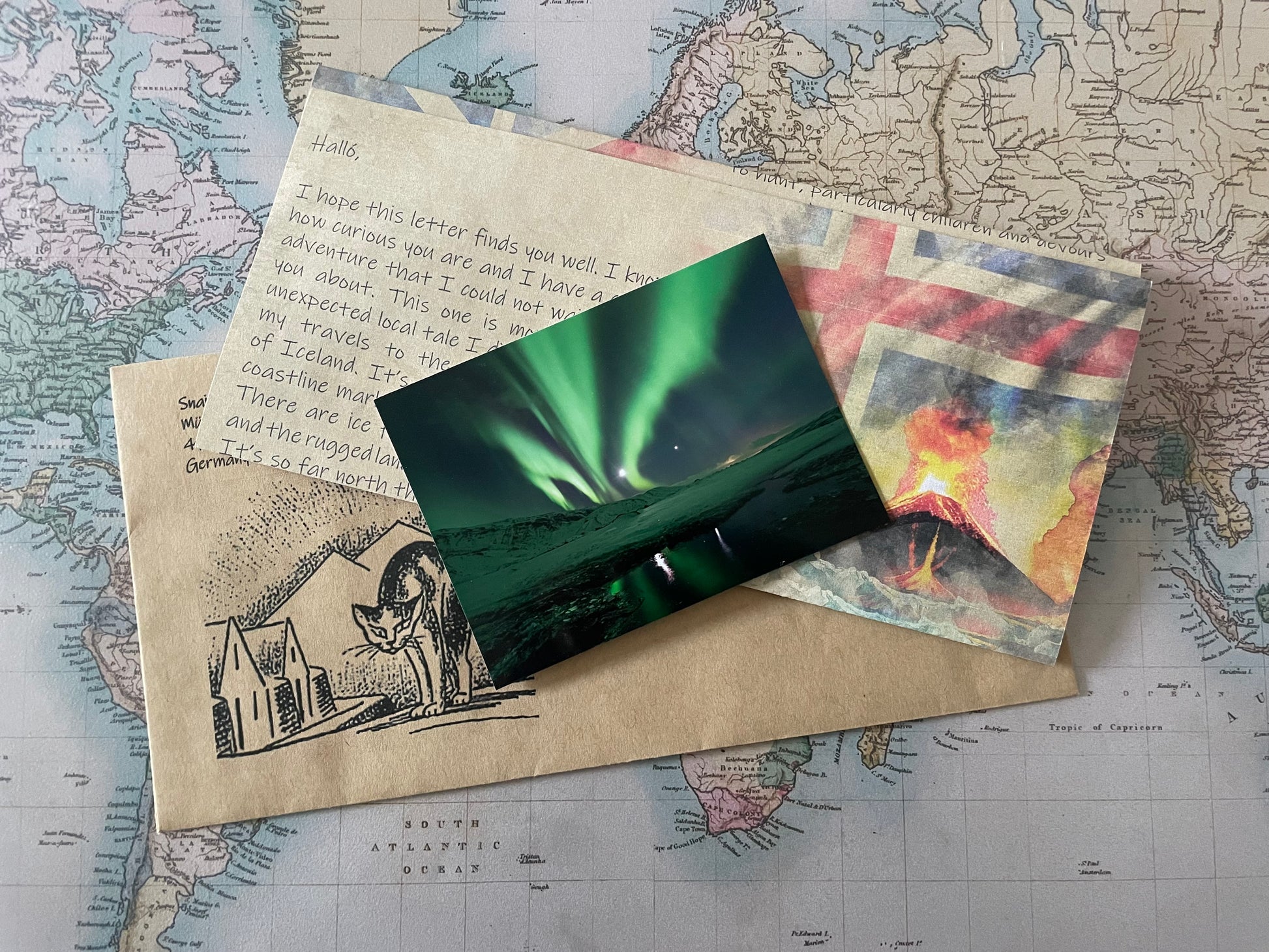 - The paper letter includes the envelope, a real stamp, the letter and a photo of an Aurora Borealis in the countryside.